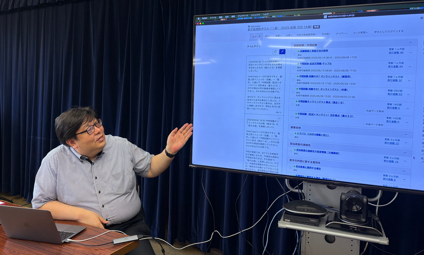 私が崇城大学に着任したのは2010年ですが、その時点で既にWebClassは導入されていて、「せっかくあるのなら使ってみよう」と自然な形で使い始めました。実はそれ以前、熊本大学でもeラーニングの開発に関わっていた経験があり、教材のWeb活用には抵抗がありませんでした。当時は板書中心の授業でしたが、板書の写真を撮ってWebClassにアップすることで、欠席者や復習したい学生にとっての補助資料として活用できると感じました。