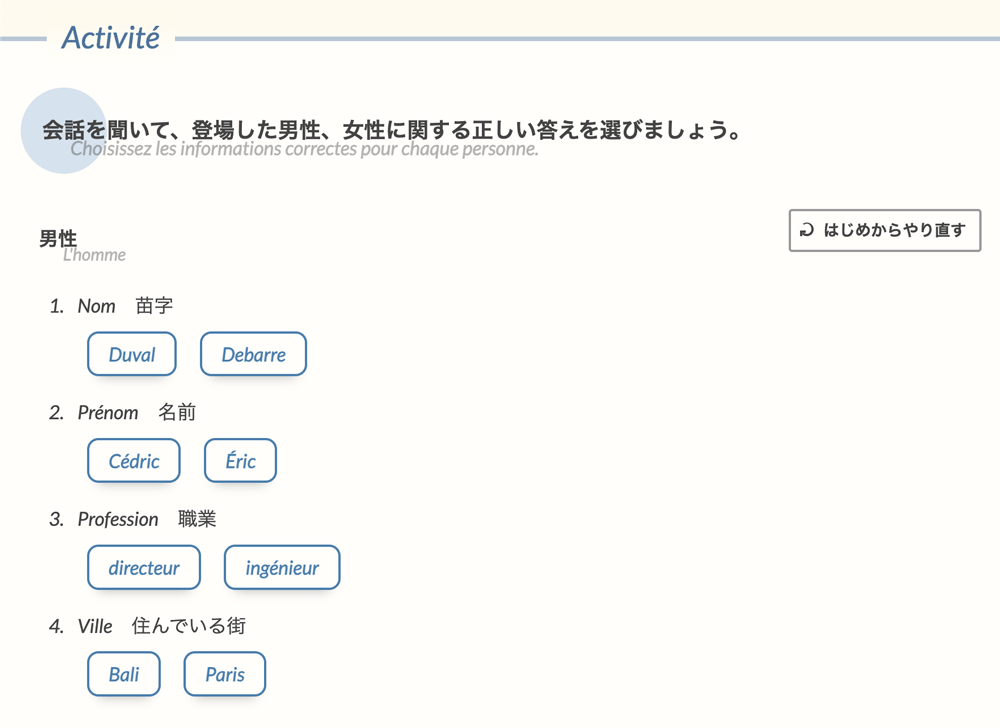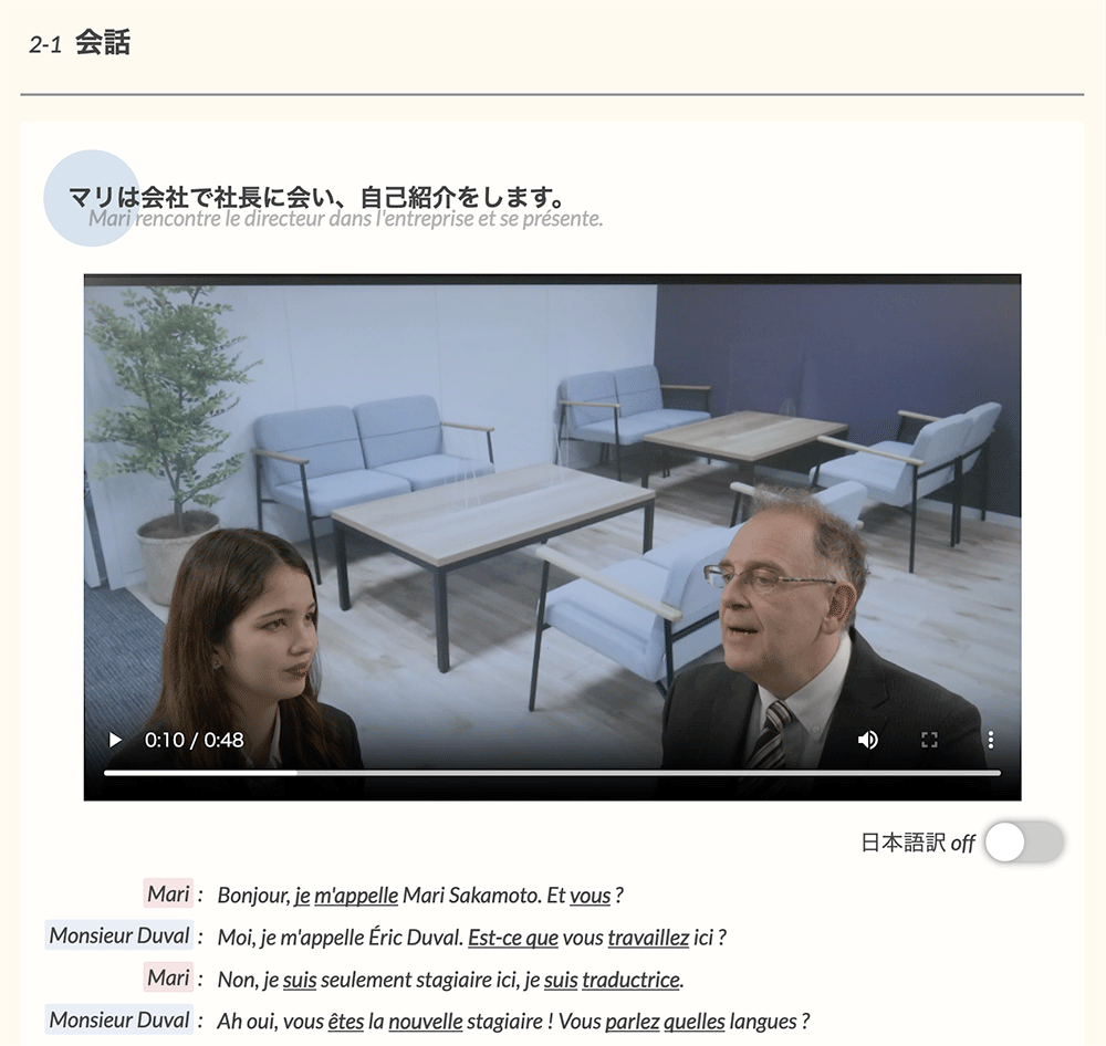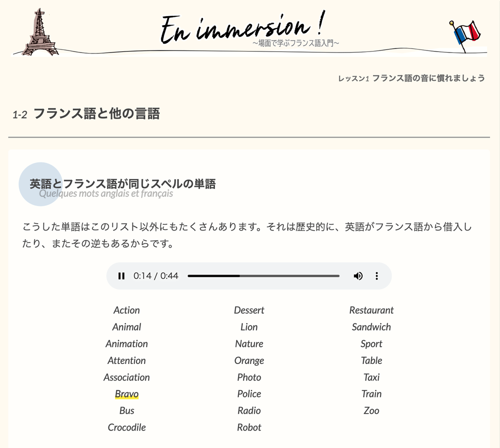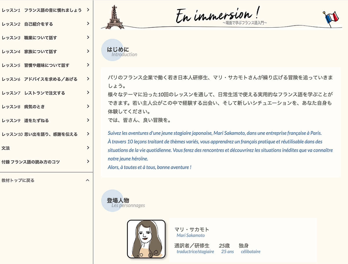 動画、練習問題、文法説明、文化コラムによる初級フランス語総合教材です。「音声から学ぶ」を特徴として、豊富な動画と音声でフランス語の読み方に焦点を当てています。