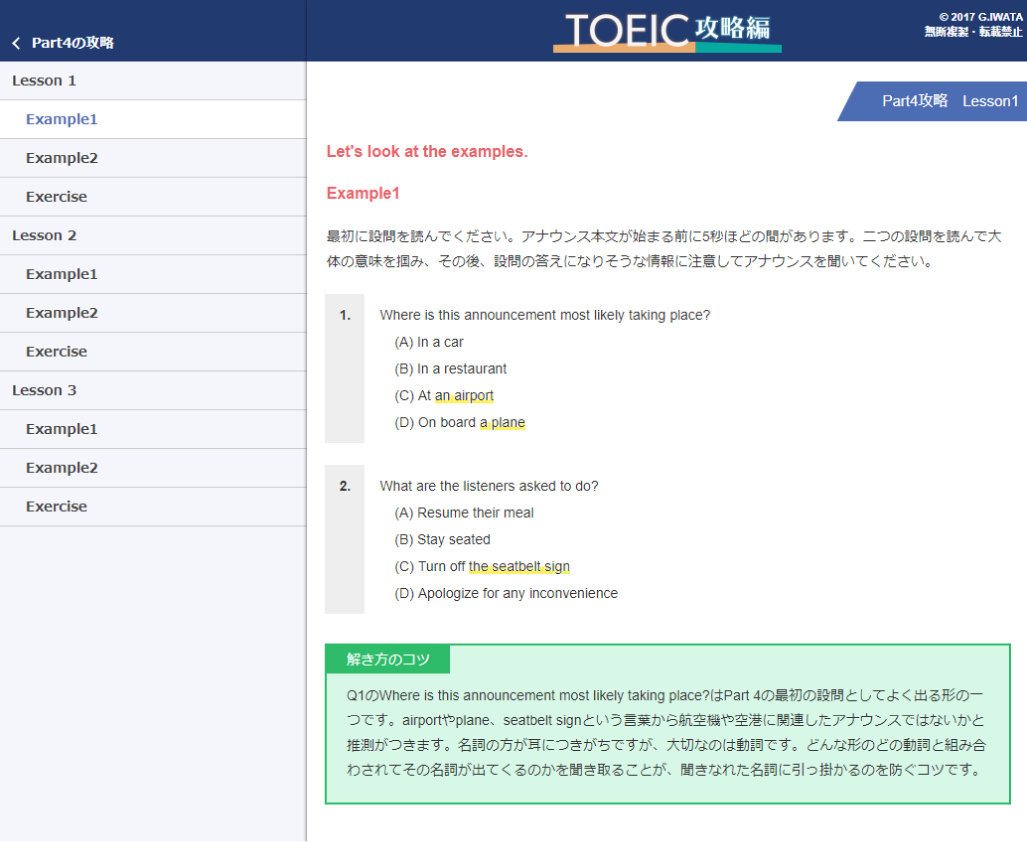 - Part4の攻略(3レッスン それぞれ例題4問、練習問題6問)
