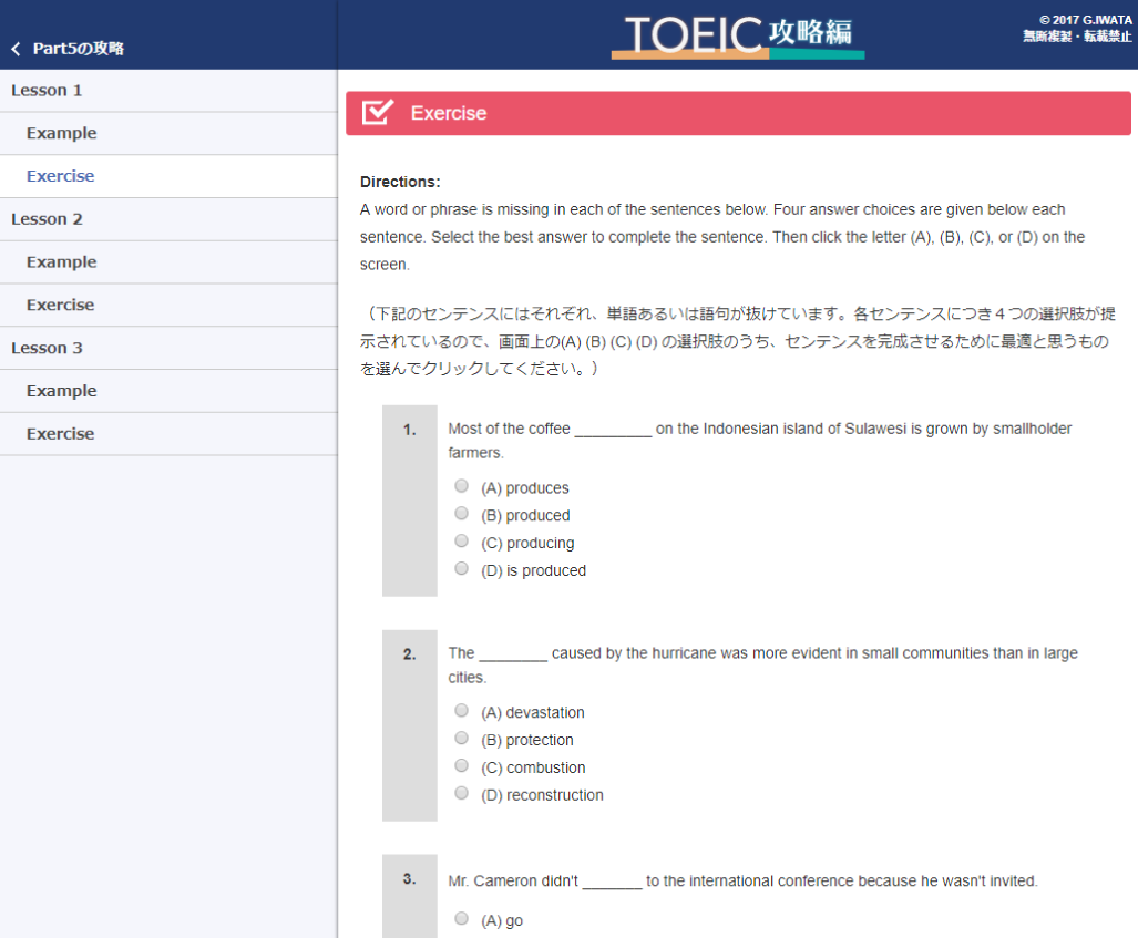 - Part5の攻略(3レッスン それぞれ例題1問、練習問題8問)
