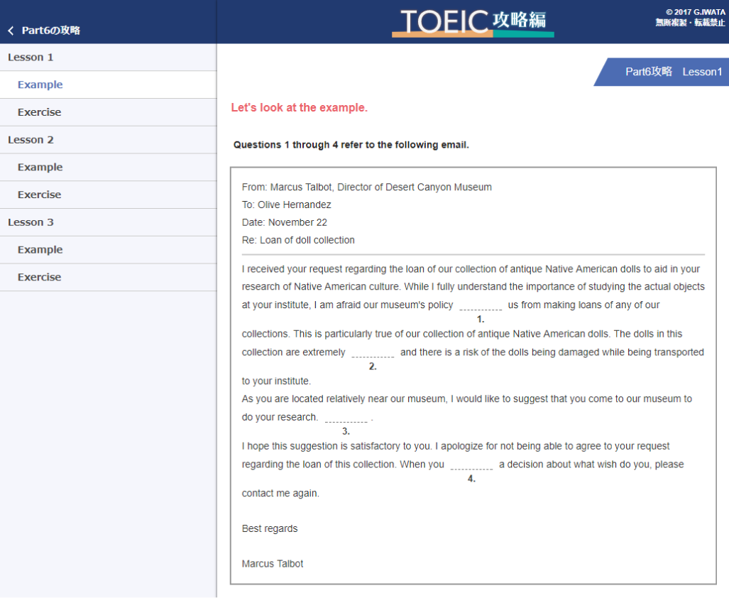 - Part6の攻略(3レッスン それぞれ例題4問、練習問題4問)
