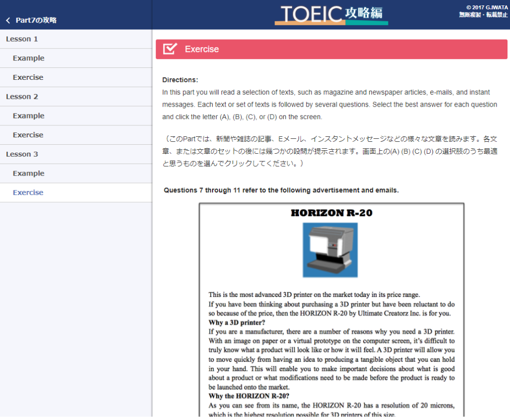 - Part7の攻略(3レッスン それぞれ例題2~5問、練習問題3~5問)